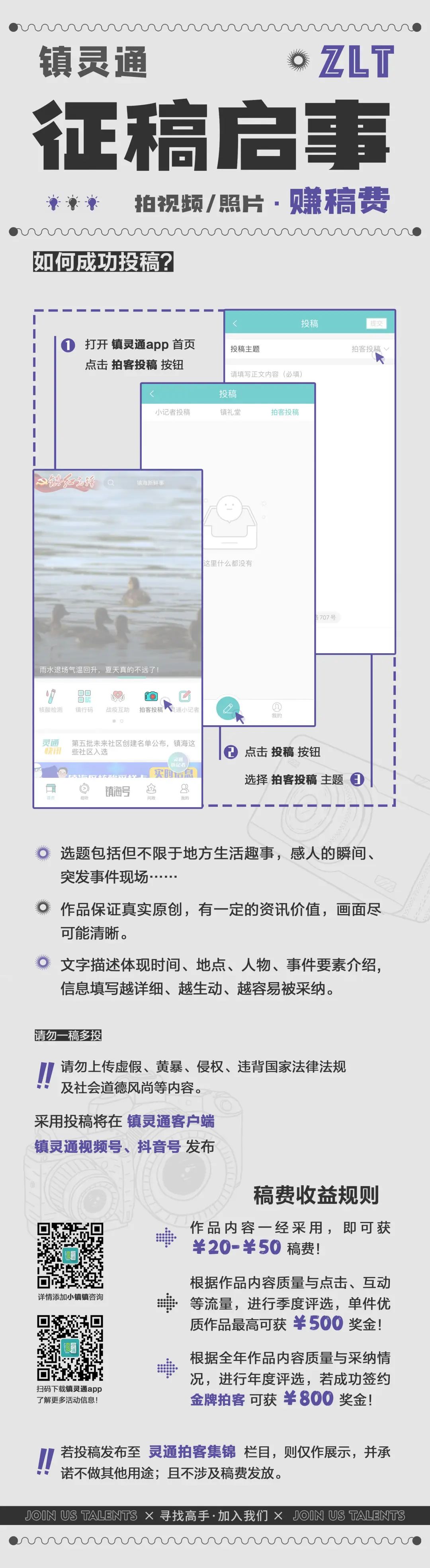 1.所有投稿作品和素材经审核筛选后将有机会在镇灵通APP、镇灵通视频号、抖音号等平台推送,并择优向上级新媒体平台推荐。