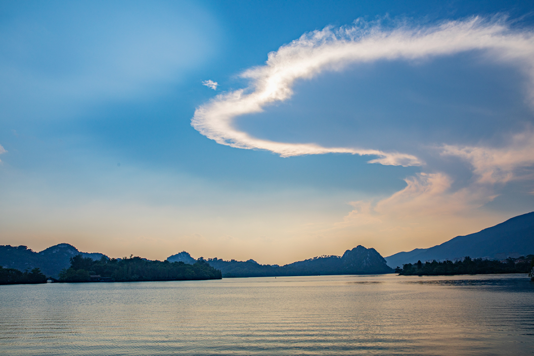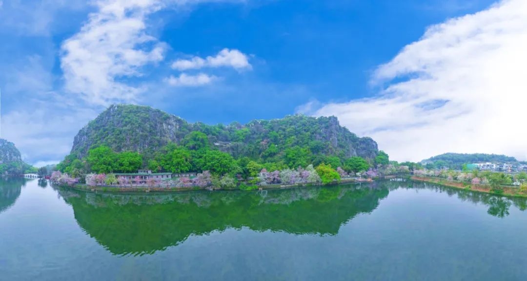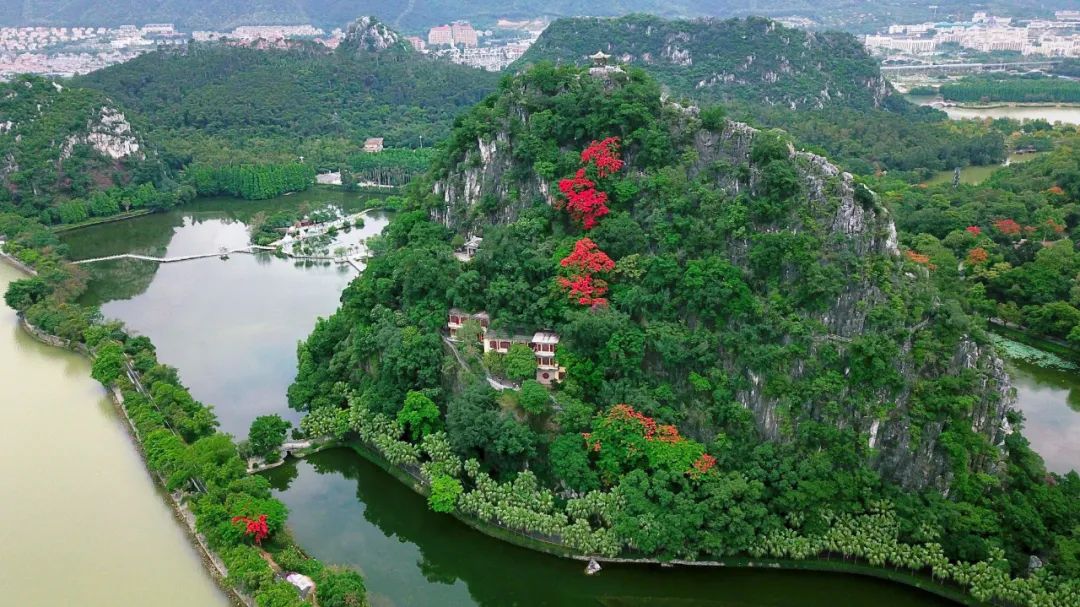 玉屏叠翠 果然风景这边好,如此江山何处来。郭沫若诗赞的玉屏岩,岩南坡壁立如屏,面向里湖,常年绿树茂密,苍翠欲滴。夏秋间盛开鸡蛋花和剑花,芬芳馥郁。花如玉,岩如屏,故名玉屏,又因满岩的常绿树,被称为玉屏叠翠,恰如其分。玉屏岩为道教名山,山上有三仙观、玉皇殿、十八奶娘庙等庙观,民间传说此处有仙气、灵气,常年香火鼎盛。登山道沿途有十友亭、状元碑、三仙观、八音石、含珠径等众多胜迹。该景入选1981年七星岩二十景和2012 年七星岩十景,最佳观赏点在湖心亭。