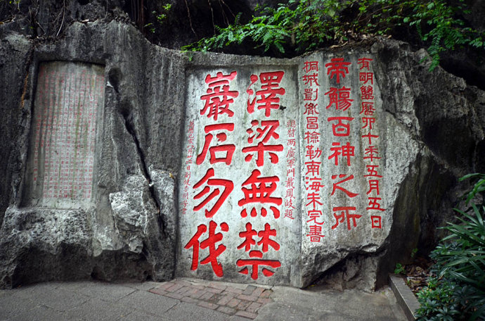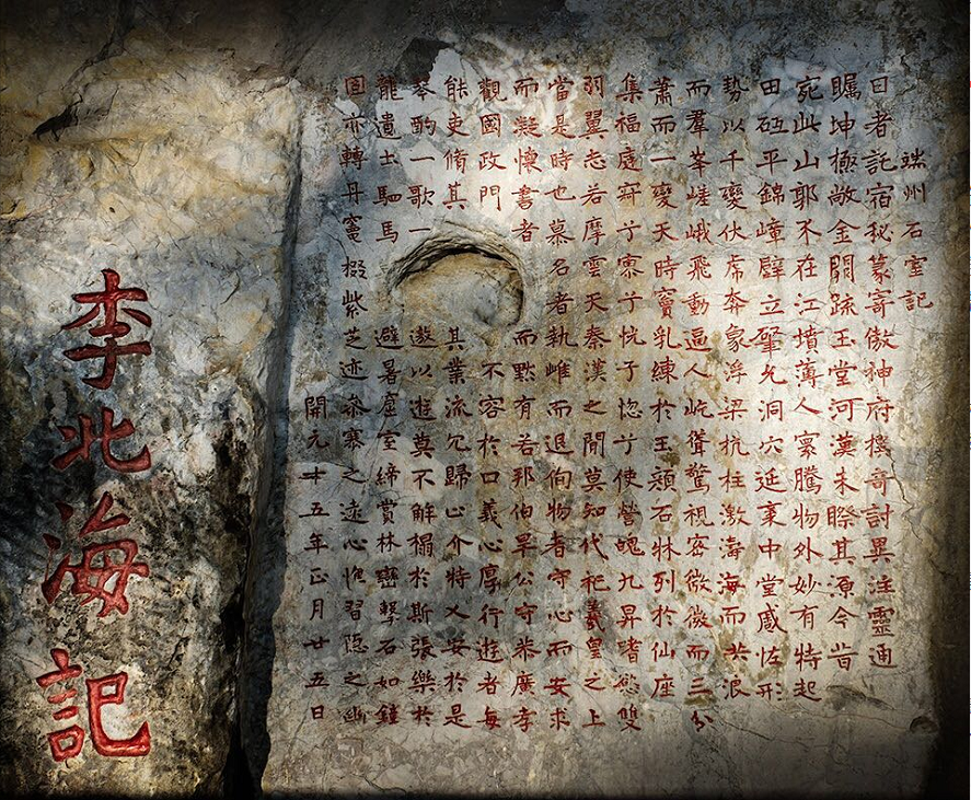 铁壁森千寻,云门讶百丈。门前北海记,快读神先王。清代诗人冯敏昌所说的北海记位于石室洞洞口外东侧,内有唐开元十五年(727 年)著名文学家李邕撰写的《端州石室记》,是李邕遗传于世唯一的正书,也是我国书法艺术的珍品。全国遗留下来的李邕碑刻,仅有湖南的《岳麓碑》和《端州石室记》。《端州石室记》书法结构严谨、端庄,用笔圆滑方正、刚劲有力,内容歌颂大自然美景。该石刻原文有381字,经过1000多年的风雨,在清初只存348字,至清末仅剩319字。至2000年,清晰可辨的仅存304字。为保护此碑,民国二十七年(1938年),李磊夫(广东省第三区行政督察专员兼保安队司令)捐建一护碑亭。1957年改建原护碑亭,并改称北海碑亭。1961年由政府拨款增建瓦顶,后又在碑前加建一水泥柱铁栏杆,避免人为损坏。2012年,在碑亭东侧的岩壁上,新刻《端州石室记》原文(按字迹补齐),以供人们研究欣赏。