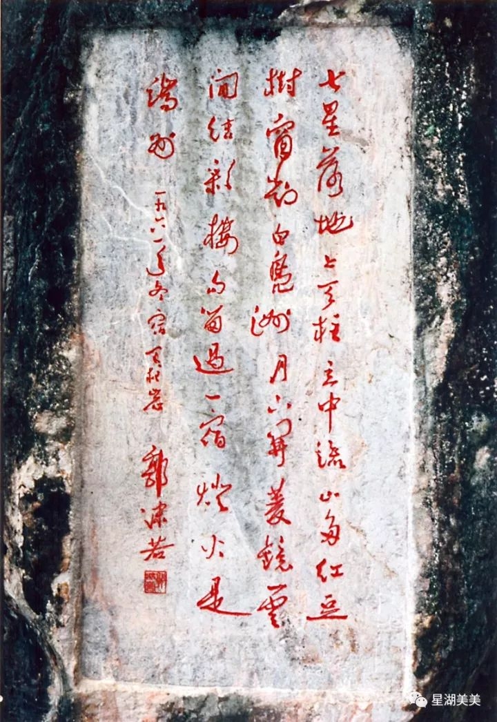 处在天柱岩南麓的湖滨路旁,有一小块地,常年阴郁,环境幽雅,侧旁矗立着一块巨石,上面镌刻着著名文学家郭沫若题诗:七星落地上,天柱立中流。山多红豆树,窗对白凫洲。月下开菱镜,云间结彩楼。勾留过一宿,灯火是端州。诗是1961年冬郭沫若游七星岩住宿在天柱阁时所题。巨石旁有一树冠宽大、树叶细小的红豆树,盛夏婆娑,冬天落叶,秋后结果,深冬果荚成熟,纷纷散落地上,点点朱红,光色耀眼。游人多在此觅红豆作珍品留念,赠友人以寄托相思之情。