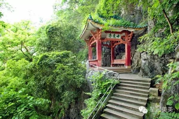 位于玉屏岩磴道中途,游客在亭内远眺中心湖,一片浩渺湖水中,有一座弯曲的绿色幽堤,分外迷人。