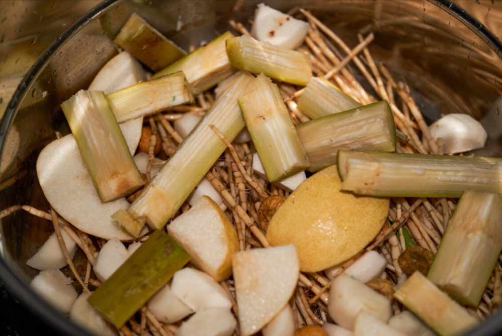 材料:猪骨头、竹蔗、马蹄、茅根、生姜、盐