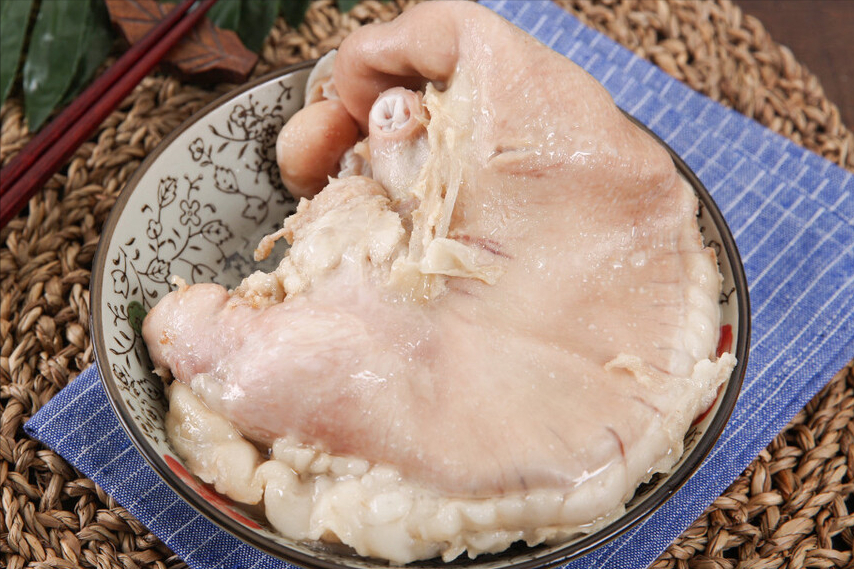 2、猪肚的处理,就要用到面粉了,把两面分别用面粉搓洗片刻,再用清水洗净即可。烧一锅开水,猪肚中记得撑一个盘子,以免发生回缩,将猪肚放入开水锅中焯烫3分钟,取出备用。